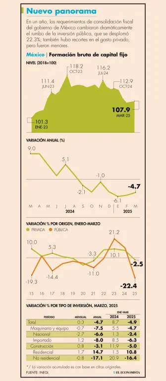 El leve repunte que tuvo en marzo del 2025 no impidió que la inversión fija ejercida en México tuviera un descenso interanual acumulado durante el primer trimestre de 4.9%, lo que significó su peor dinámica para un inicio de año desde el pandémico 2020, mostraron cifras del Instituto Nacional de Geografía y Estadística (INEGI) publicadas este miércoles.