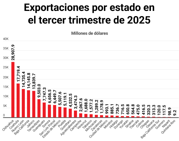 El liderazgo corresponde a Chihuahua, que por sí solo concentró 18.9% de las exportaciones nacionales, con un valor de 28,907.9 millones de dólares entre julio y septiembre. Su peso responde al dominio del sector manufacturero, que representó 98.8% de sus ventas externas, impulsado por la fabricación de equipo de computación, comunicación y componentes electrónicos, así como por el equipo de transporte.