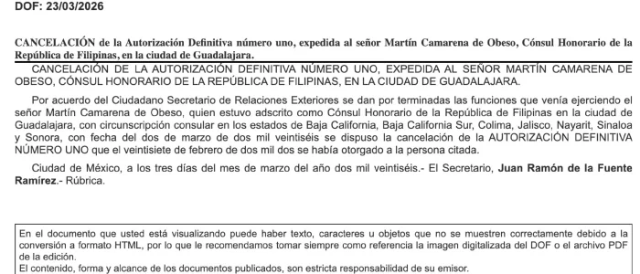 “Por acuerdo del ciudadano Secretario de Relaciones Exteriores se dan por terminadas las funciones que venía ejerciendo el señor Martín Camarena de Obeso, quien estuvo adscrito como Cónsul honorario de la República de Filipinas en la ciudad de Guadalajara. Con fecha definitiva del 2 de marzo de 2026 se dispuso la cancelación de la autorización definitiva número uno”, indicó la Cancillería en el Diario Oficial de la Federación (DOF).