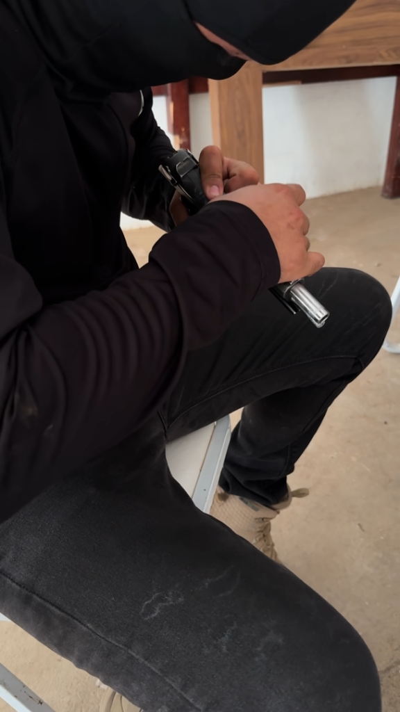 Una tarde reciente, dos hombres con máscaras negras se encontraban inclinados sobre una mesa. Uno frotaba una pistola Colt con un cepillo de dientes, quitando suciedad de sus hendiduras. El otro echaba gotas de aceite de cocina sobre el metal y pulía una segunda pistola, grabada con motivos en espiral en tonos dorados.