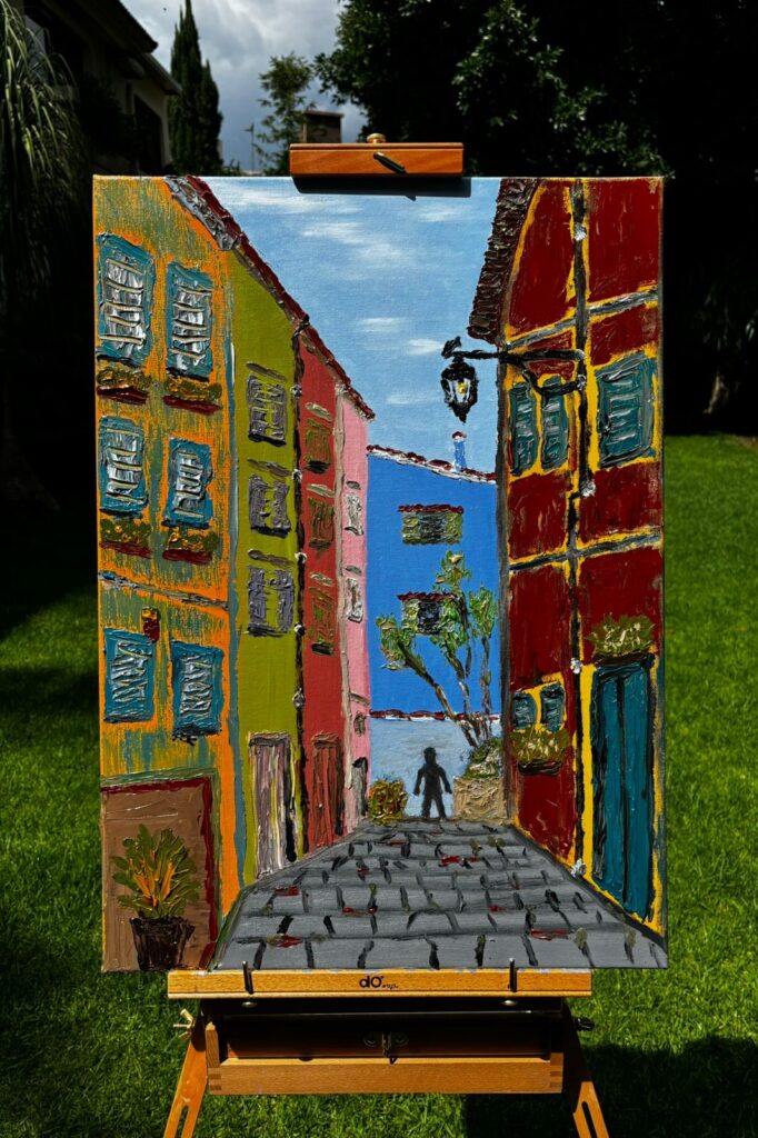 Inspirada en la Riviera Francesa, la obra de Álvarez entrelaza lo sensorial y lo metafísico: la calidez de las callejuelas mediterráneas, los colores vibrantes y la textura de la piedra antigua se convierten en escenario de una búsqueda existencial. El adoquinado irregular, intencionadamente medieval, marca un trayecto imperfecto, cargado de historia y tropiezos, que conduce la mirada hacia el horizonte.