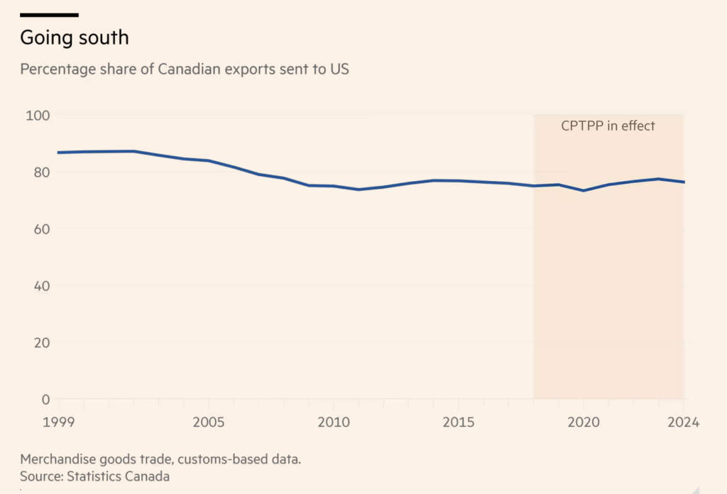 De manera similar, Canadá ayudó a rescatar el Acuerdo Transpacífico de Cooperación Económica (TPP) de Asia y el Pacífico (ATP) después de que Trump lo abandonara en 2017. Esta asociación, formada principalmente por potencias comerciales medianas, se lanzó en diciembre de 2018, rebautizada como CPTPP, y ahora cuenta con 12 miembros. Sin embargo, estos acuerdos no han diversificado significativamente el comercio canadiense. La participación de Estados Unidos en las exportaciones canadienses, tras haber disminuido del 80% a mediados de la década de 2000 al 70% en 2010, se estancó.