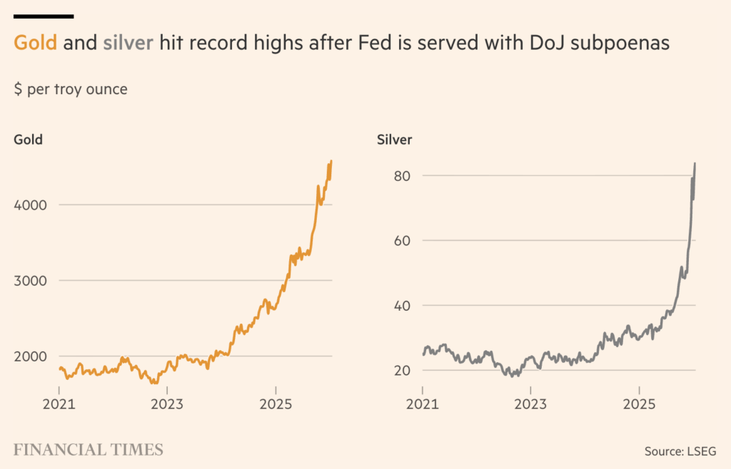 El oro subió a un máximo histórico y el dólar y los futuros de Wall Street cayeron el lunes después de que los fiscales estadounidenses iniciaron una investigación criminal sobre el presidente de la Reserva Federal, Jay Powell, avivando las preocupaciones sobre la independencia del banco central.