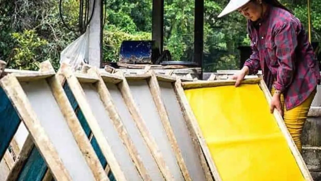 Luego se seca en una especie de tamiz cuadrado donde las láminas quedan listas para ser utilizadas en lo que, según sus responsables, es el papel más ecológico del mundo.