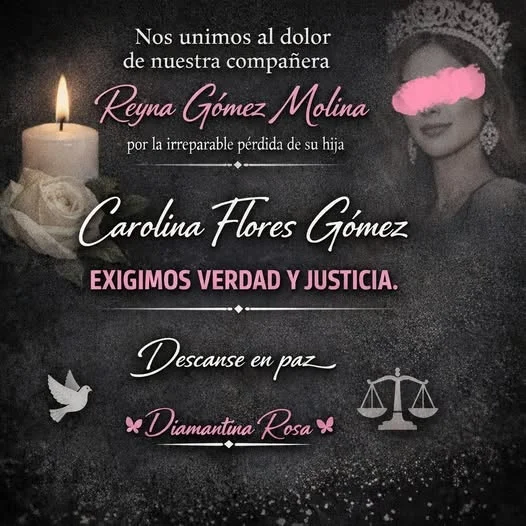 También el colectivo de mujeres ensenadenses Diamantina Rosa, al que pertenece la madre de la víctima, manifestó su solidaridad y exigencia de justicia: «Nos unimos al dolor de nuestra compañera Reyna Gómez Molina, integrante de Diamantina Rosa, por la pérdida de su hija: Carolina Flores Gómez. Exigimos verdad y justicia. No habrá silencio ni olvido. Descansa en paz, Carolina», publicaron.