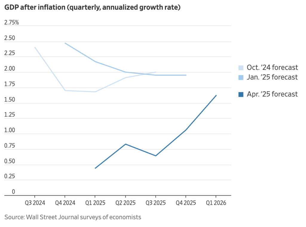 Los economistas se han visto afectados por los fuertes cambios en la política arancelaria en las últimas semanas. Al ver que los aranceles «recíprocos» entraron en vigor el 9 de abril, los economistas de Goldman Sachs elevaron su estimación de probabilidad de recesión del 45% al 65% y recortaron drásticamente su pronóstico del PIB, solo para volver a las proyecciones anteriores después de que Trump anunciara la pausa de 90 días.