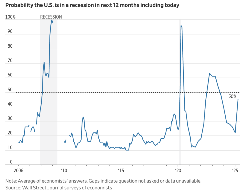 También aumentaron su probabilidad estimada de recesión en los próximos 12 meses al 45%, frente al 22% en enero.