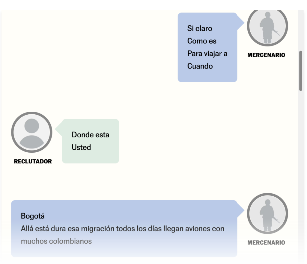 “El trabajo es para un cartel, al menos son 40.000 pesos mexicanos, en pesos colombianos son 10 millones mensuales. El tiempo mínimo es por cuatro meses. El trabajo es cuidando la plaza, que nadie se meta y limpiar a los que se quieran meter. Hacer lo que el comando de zona le ordene. Alguna pregunta?”. Así se anuncian las ofertas en una cadena de mensajes a los que ha tenido acceso este diario. El reclutamiento de mercenarios colombianos, con edades entre los 22 y los 42 años en su gran mayoría, se hace de forma ostensiblemente abierta y se produce a través de redes sociales y servicios de mensajería como WhatsApp. “Ah bueno, le hacemos, yo estuve en Ucrania, a México no he ido antes”, responde uno en el mismo grupo. “Mi compa, la empresa está dando los pasajes. Lo único que tiene que traer es para el taxi, para el camión, para comer todo se lo está dando la empresa, ¿ok? Son 48.000 pesos mensuales de sueldo, libre de comida y dormida. Es un cartel”, se lee en otra de las conversaciones.
