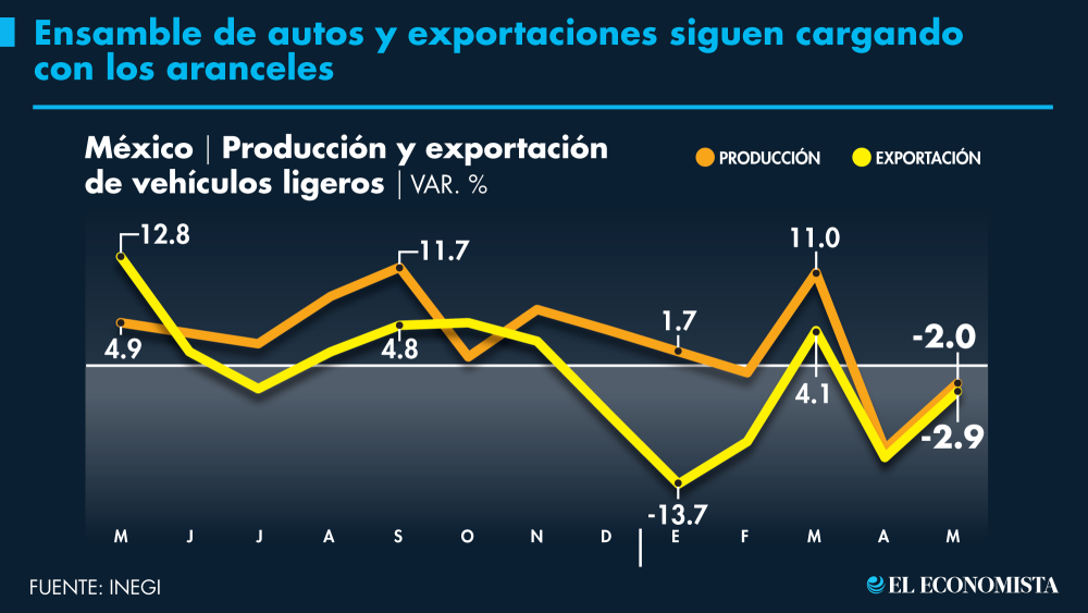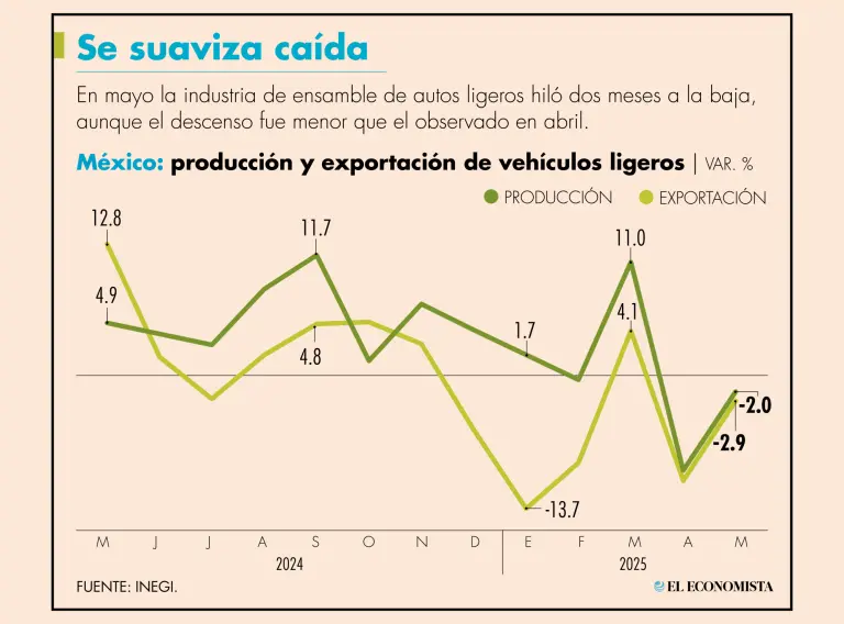 Las empresas automotrices acumulan dos meses consecutivos de caída en la producción, exportación y ventas internas, pero los descensos de mayo pasado fueron inferiores a los de abril, cuando Estados Unidos, el principal mercado de las plantas de ensamble mexicanas, impuso aranceles generalizados de 25% a la importación de vehículos ligeros y pesados.