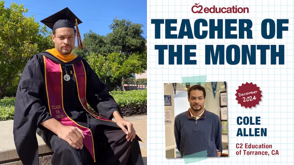 A la izquierda, Cole Allen en una imagen publicada en su Linkedin en 2025 tras graduarse en un Master de Informática. A la derecha, Cole Allen profesor del C2 Education de Torrance tras ser elegido mejor maestro del mes en diciembre de 2024. Foto: Linkedin/Facebook | Vídeo: EPV